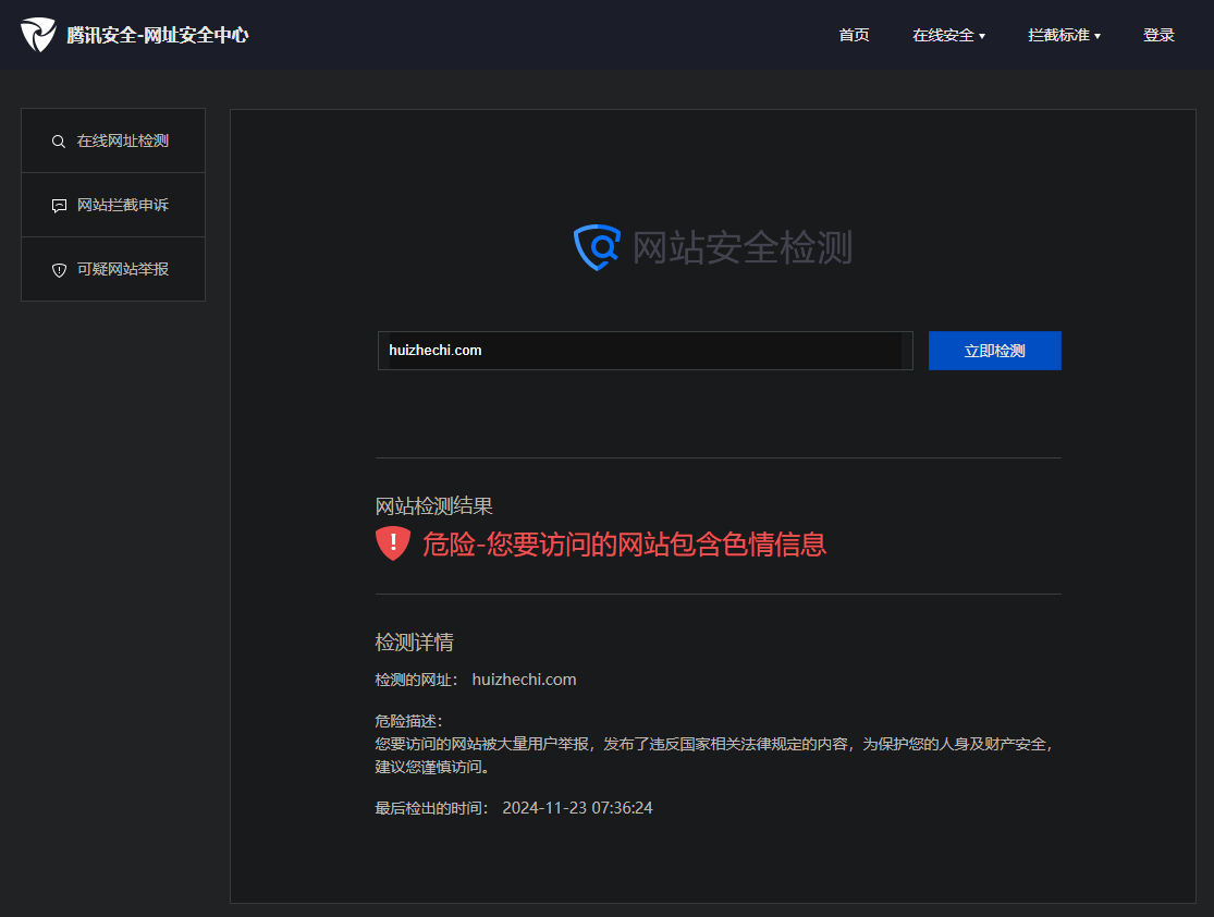 我心想这是什么鬼?我的博客又没有被挂马又没有被篡改,更没有放什么色情内容。我逐个查看,真的是奇了怪了。前些天都好好的,就今天不行了?于是乎我查看了一些规则,以及“微信开发社区”那里,综合一些用户的回答来看,可能是新域名+未备案的影响。后来,在腾讯网址检测那里,找到了具体的原因和时间: