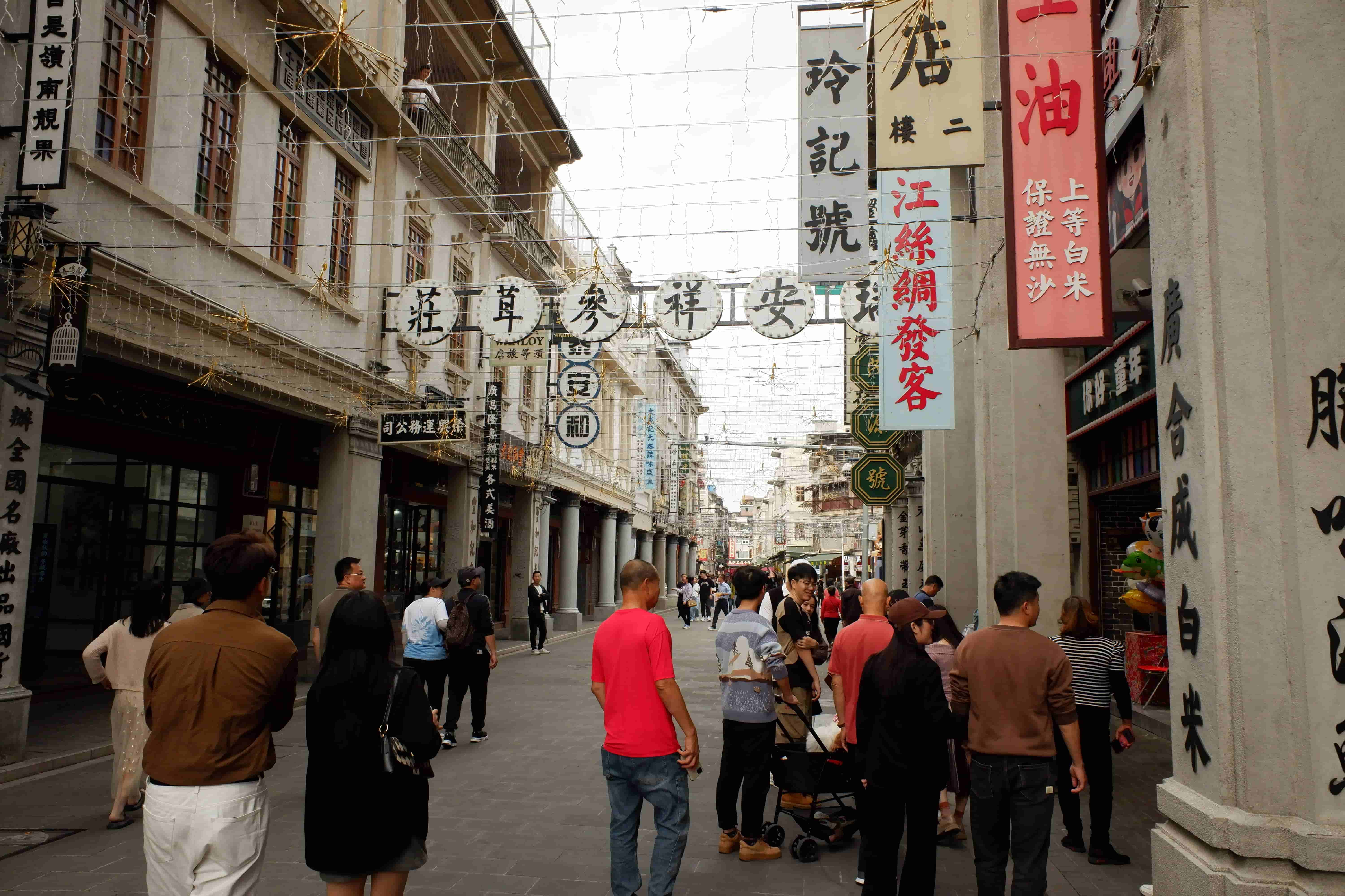 当逐渐走到“中山纪念亭”时,人流也多了起来,甚至有老年旅游团。好友说,那年过年过来的,真的是人山人海。周边的商铺也多了起来,毕竟这里是中心。贩卖的,也是颇具汕头特色的,印象深刻的是那些印有繁体字“汕頭”的文创作品。而汕头本地的美食,也是非常非常多的。无论是生蚝煎、鲎粿等以海洋动物为主的小吃,还是油柑汁、绿豆饼等潮汕零食,都是任君选择的。当然,还有当前比较火热的一些奶茶饮品,对这我倒是不怎么感冒。美中不足的是,很多旧式招牌,都是卖现代产品的,略有“挂羊头卖狗肉”之意了。